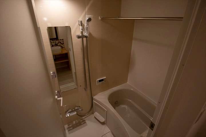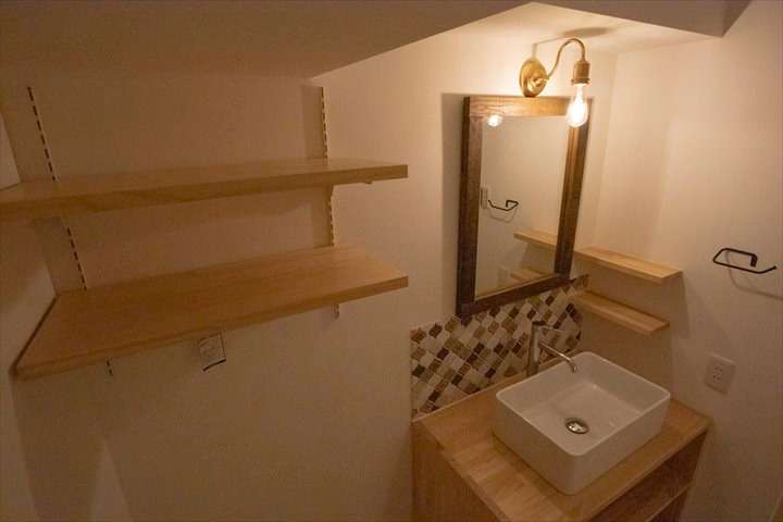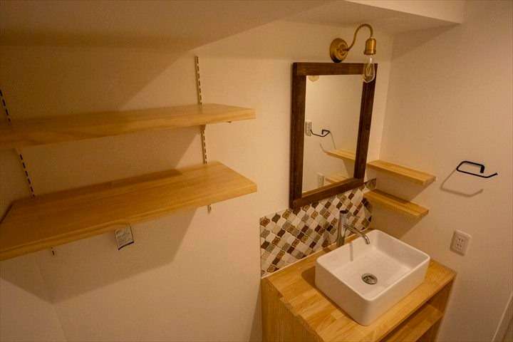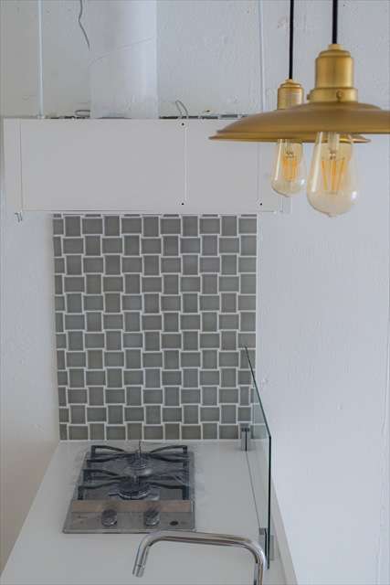 真鍮仕上げのペンダントライトと、アクセントタイルが映える仕上がりになっています。